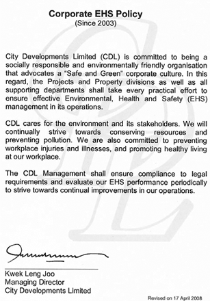 CDL is a founding signatory of the “Pledge for Zero — A CEO Commitment Charter” which was launched at the inaugural Construction CEO Summit organised by the Workplace Safety and Health Council in November 2008. CDL adopted the pledge and committed to establish a zero injury workplace. In 2010, CDL invited our builders and consultants to sign the pledge as well and collectively commit to raising the EHS standards at our worksites in Singapore.