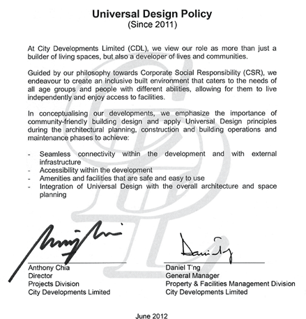 The Universal Design Policy, which is endorsed by CDL’s top management, provides the Company with a framework to achieve our objective of creating an inclusive built environment that caters to the needs of all age groups and people with different abilities, allowing them to live independently and enjoy access to facilities.