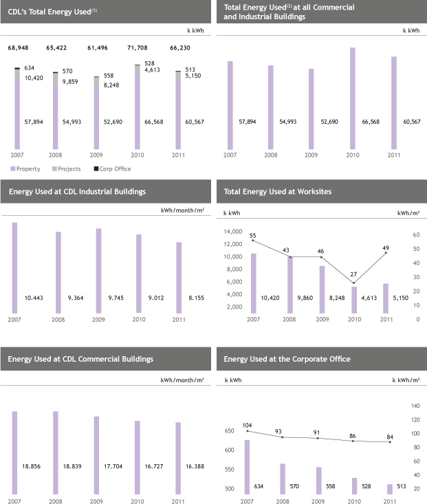CDL has introduced various energy conservation and efficiency improvements projects in our investment properties(3). For instance, King’s Centre will reap an estimated energy savings of 483,017 kWh per year by the chiller plant, replacement of less efficient lightings and adopting the use of solar panels in 2011. For some investment properties, sensors are installed to monitor carbon dioxide levels in offices, and carbon monoxide levels in the basement car park. Since 2007, the Company’s “1°C Up Programme” has become a standard BAU practice at CDL buildings, keeping indoor temperatures at 24°C on average.