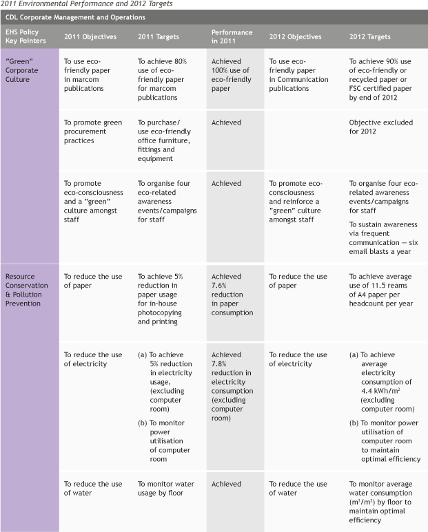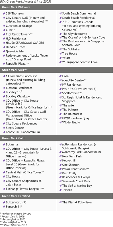 CDL has been a leader of Singapore's built environment and championing the development of more sustainable buildings even before the introduction of BCA's Green Mark in 2005. CDL invests between 2% and 5% of the construction cost of a new development on green building design and features and we have raised the target of achieving a minimum BCA Green Mark GoldPlus rating for all new developments in 2011 from a BCA Green Mark Gold.CDL’s key BCA Awards and accolades include: