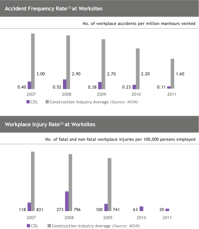 At CDL’s Corporate Office, in 2011, the percentage of employees with high Body Mass Index (BMI) (>23) was 16%, which is lower than the national average and the average medical leave per employee was 4.5 days. There was also zero occupational diseases and no loss days due to work-related fatalities.CDL remains committed to achieving the vision of a safe and healthy workplace for everyone and upholding a good safety record. Over the years, CDL’s Accident Frequency Rate (AFR) and Workplace Injury Rate remained below the construction industry’s average value as a result of the various safety promotions and engagement with the builders and their workers at the worksites.