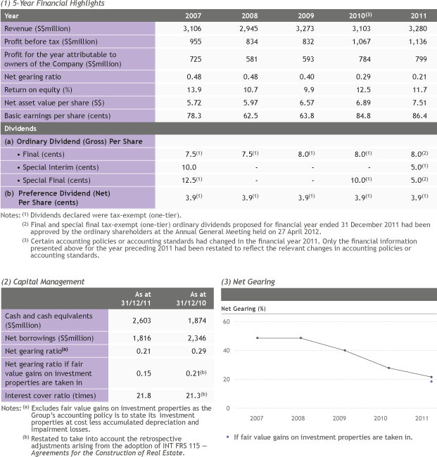 CDL’s financial information is described in more detail in our Annual Report 2011. Current and previous reports are available online at www.cdl.com.sg.