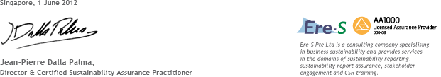 CDL engaged Ere‐S Pte Ltd to provide independent assurance on its Sustainability Report 2012. The assurance engagement was executed in accordance with a Type 2 assurance of the AA1000 Assurance Standard (AA1000AS 2008), which consists of:| A. | Evaluating the sustainability systems and processes using the inclusivity, materiality and responsiveness criteria of the AA1000 AccountAbility Principles (AA1000APS 2008). |