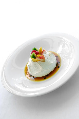 • Pavlova with Passion Fruit Butter and Strawberries