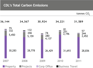 In 2011, we have reduced CDL’s total carbon intensity emissions as measured in tonnes CO2/m2 by 7% from baseline year 2007. In other words, we produced less carbon per leased square metre of area. Since 2009, CDL voluntarily reduced our annual carbon emissions to “net zero”(2) for 11 Tampines Concourse, the first CarbonNeutral® development in Singapore and Asia Pacific, and our Corporate Office operations including our data centre.