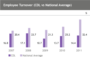 CDL’s employee turnover continued to remain significantly lower than the national average. More than 50% of our employees have been with CDL for more than five years. The average length of service of each employee was 8.9 years in 2011 (2010: 8.8 years).CDL places high emphasis on engaging our employees and ensuring that they remain satisfied, committed and motivated to play important roles in the success of the Company. CDL has been organising Employee Engagement Surveys to acquire insights into areas of potential employee-related concerns in order to proactively address them. In 2011, the Employee Engagement Survey was conducted by a third party consultant for greater impartialilty.