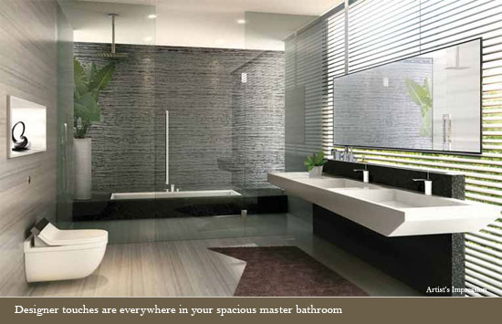 Your master bedroom is a private haven of luxurious comfort that includes a large walk-in wardrobe with concealed LED lights for your designer collection. The ensuite master bathroom stretches to incorporate a semi-recessed long bath. Most of the other two bedrooms on this floor also share an ensuite bathroom.